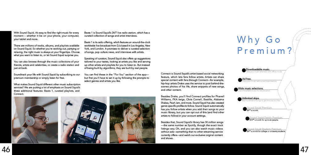 Sound Squid is the hottest new music streaming site available for people ranging from students to families. Having done all the branding necessary for the assignment, the brochure was meant to give off a vibe of fun mixed with sleekness. The design itself was meant to be simplistic but leave and impact that would stick with consumers after they had read the brochure.